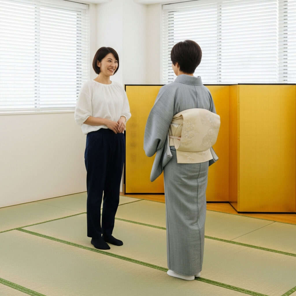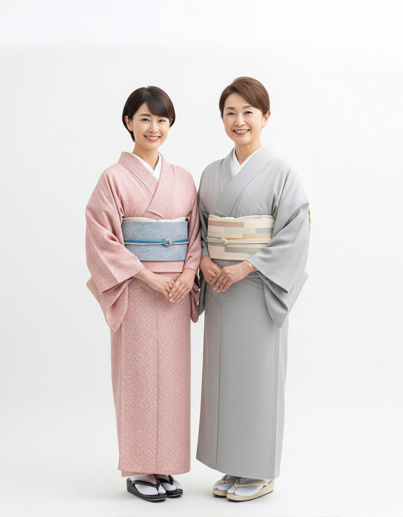 洋服の上から帯を結んでいただく体験をご用意しています。帯や小物類はすべて無料でレンタルできますので、手ぶらでお越しください。