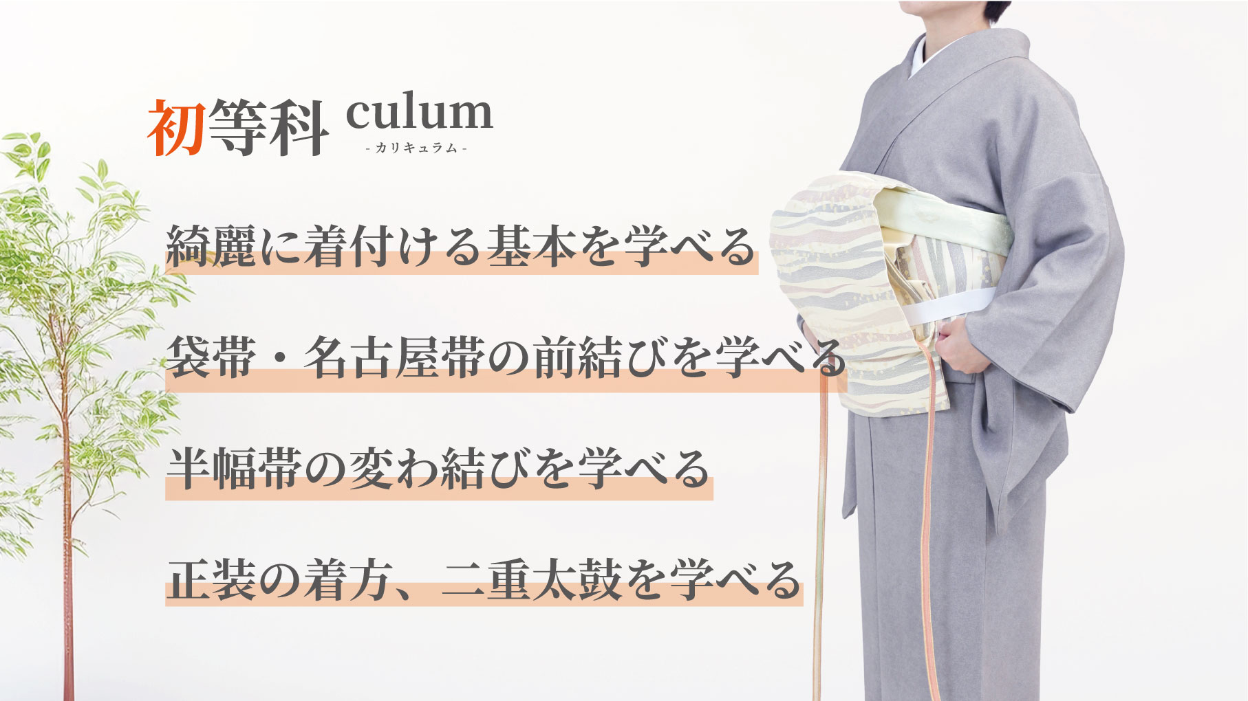 普段着の着付けから正装用の帯結びまで、やさしく分かりやすい指導で、約4ヶ月10回の受講後には着物の初歩的な知識も身に付きます。